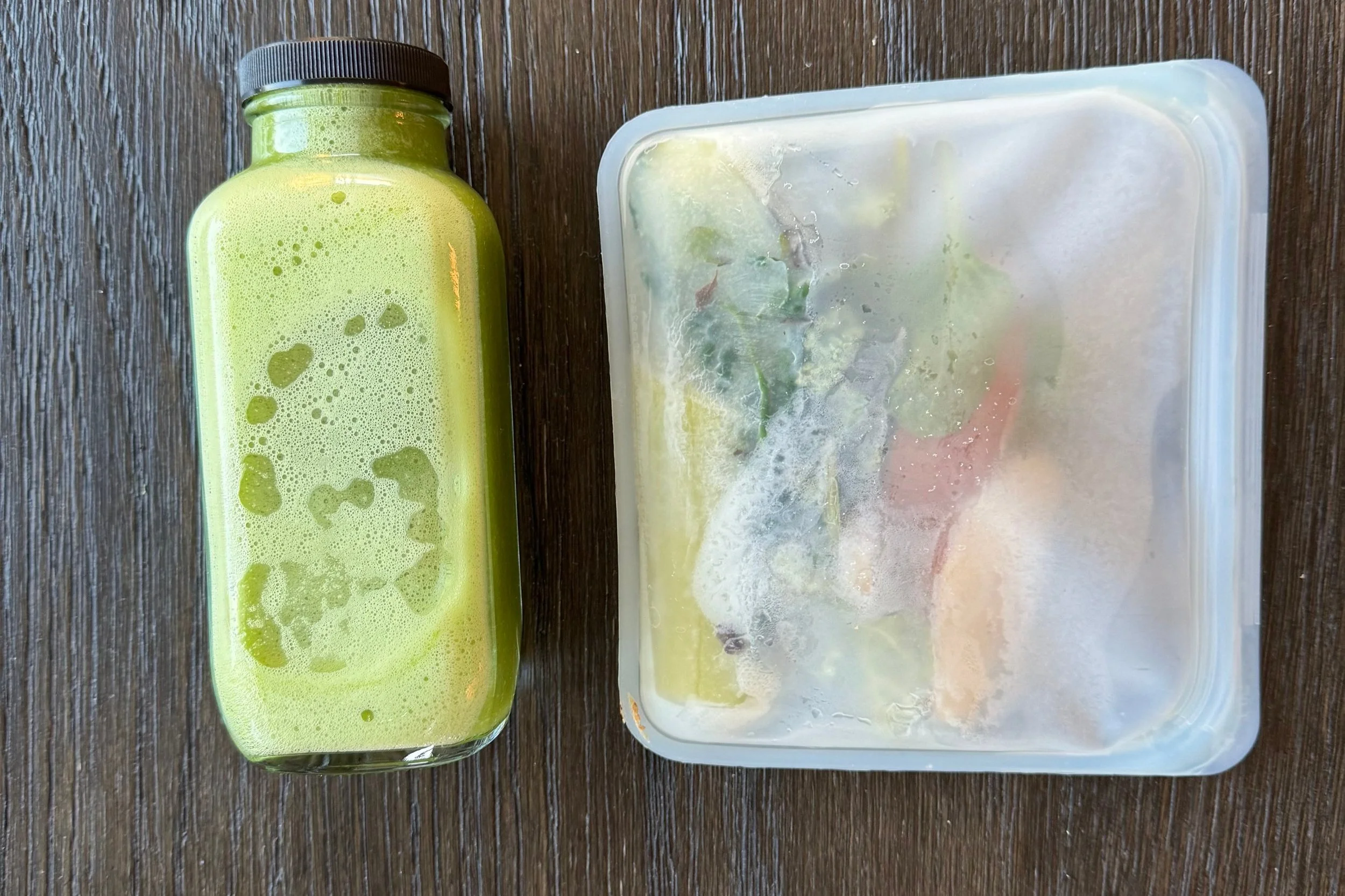 - Throw all ingredients (except for water + coconut water) into a reusable food storage bag and FREEZE – I love this Stasher Bag Bundle