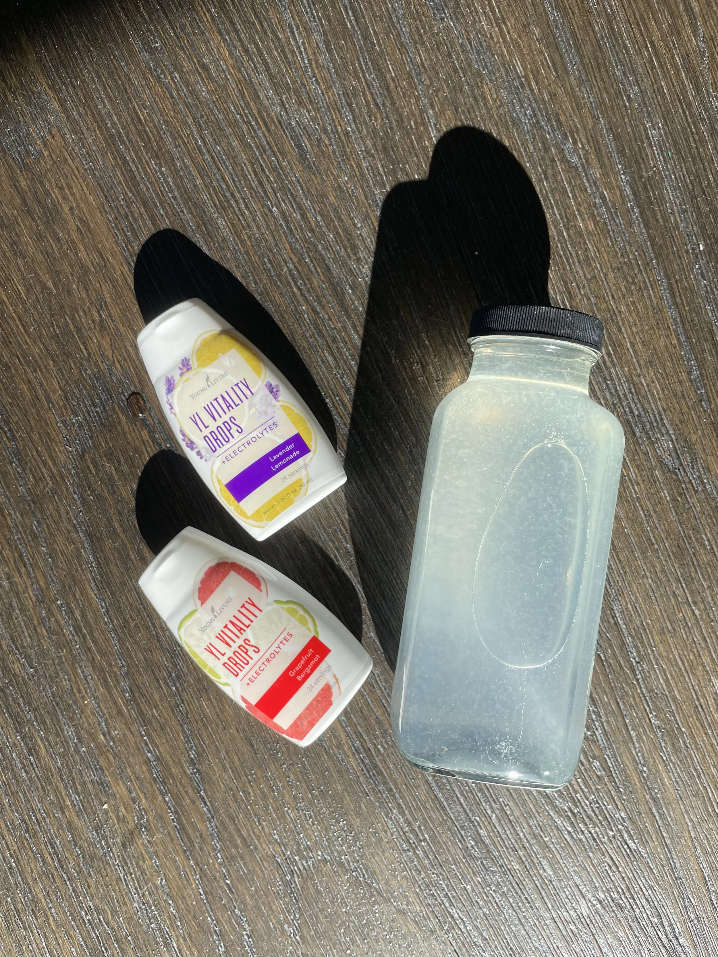 - 2-3 drops of flavored electrolytes – I love YoungLiving vitality drops flavored with essential oils and plant based ingredients, but you can buy a variety of electrolyte drops online or at the store