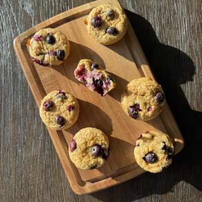 Pour batter into silicon muffin tin, add additional blueberries to tops of muffins if desired & bake at 375 for 5 minutes then lower to 350 for another 10-12 minutes or until center comes out clean with a knife. Because they are gluten free, they will not be light and fluffy and will feel more "dense" while they cool! Don't break into them fresh out of the oven or they will break.